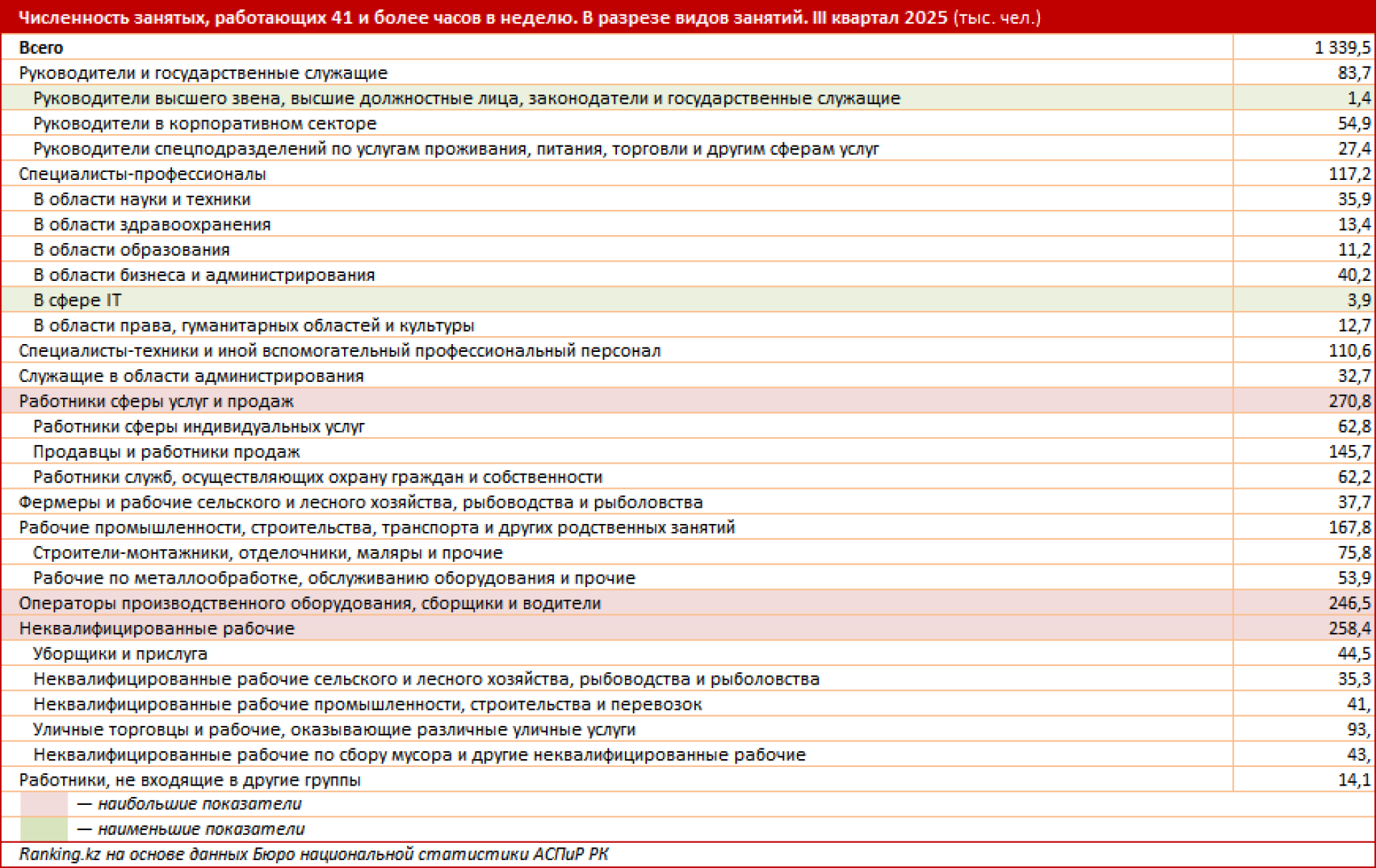 В третьем квартале текущего года более 1,3 миллиона человек, или 14,4% занятых, работали свыше 41 часа в неделю. Из них 68,9% составляют наемные работники, а 31,1% — самозанятые.