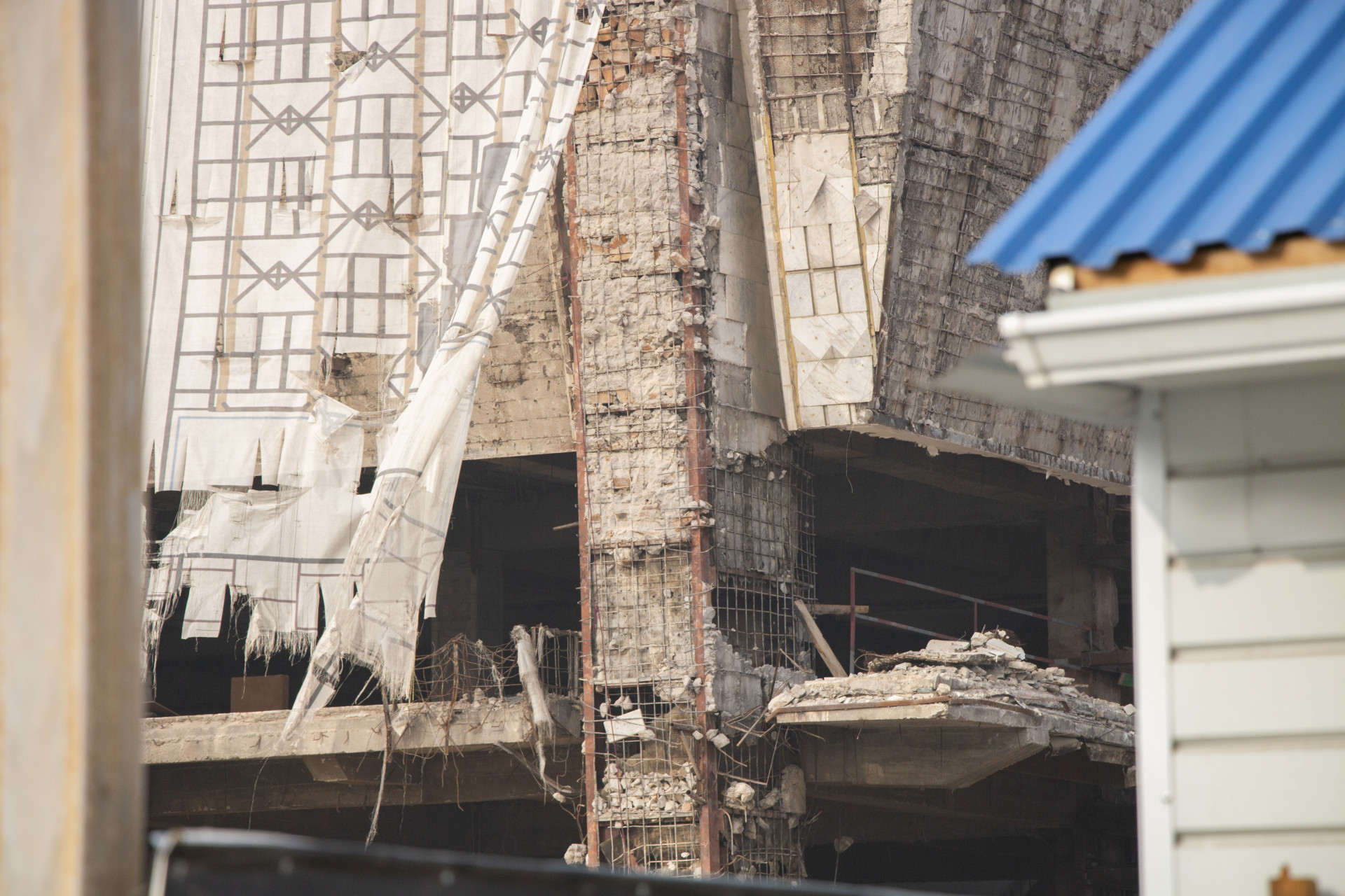 Фасад со стороны главного входа закрыт потрепанным полотном ткани, а на крыше заметны подготовленные для кровли материалы, которые не распакованы. Рабочих на крыше не было.