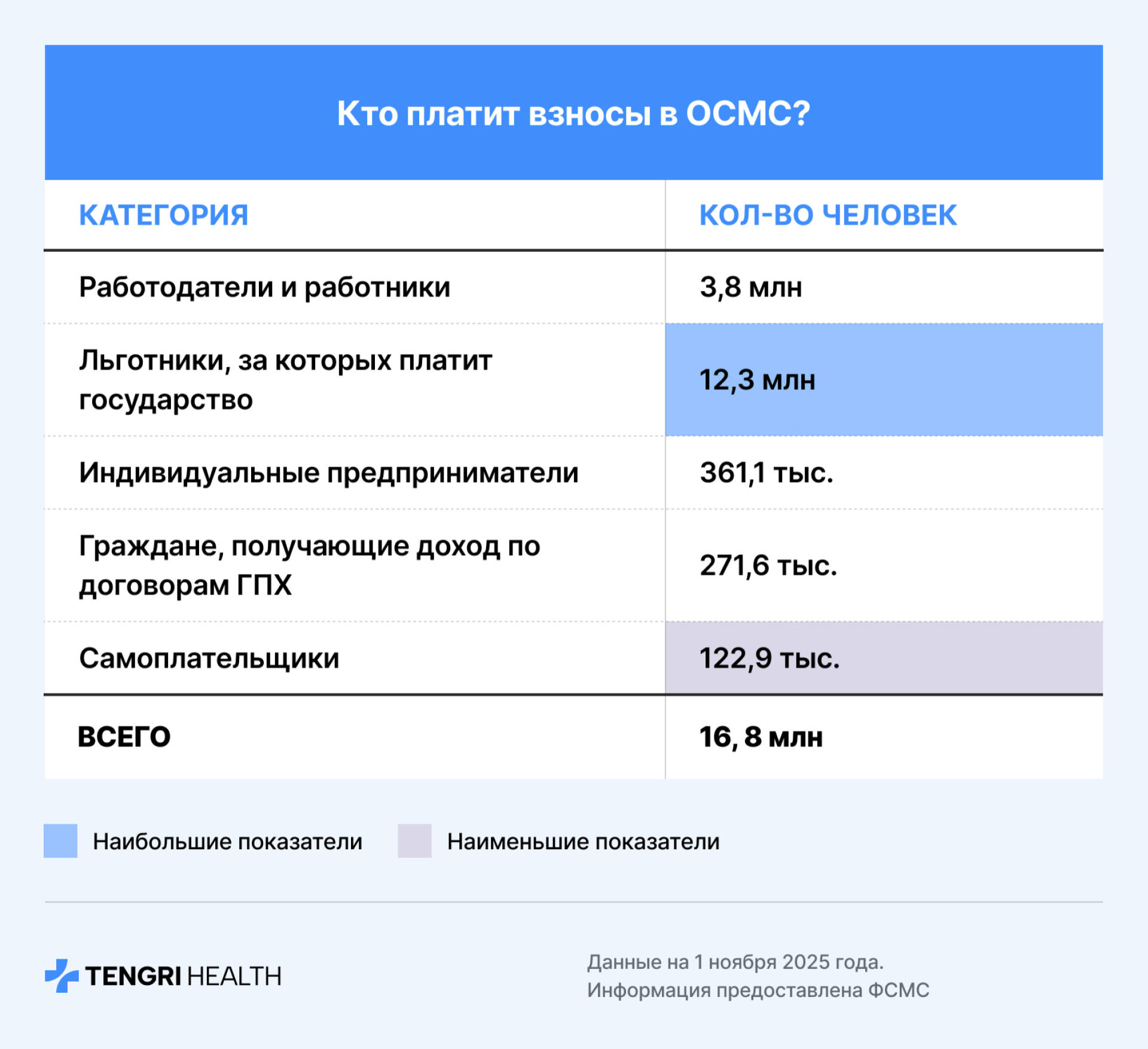 Хотя льготные категории граждан, за которых платит государство, составляют наибольшую группу, наибольшие суммы в ФСМС вносят работодатели и их сотрудники. С 2026 года их вклад возрастет, так как с 1 января изменился верхний предел дохода, с которого рассчитываются взносы: он увеличился с 10 минимальных зарплат (850 тысяч тенге) до 40 МЗП для работодателей и до 20 МЗП для сотрудников.