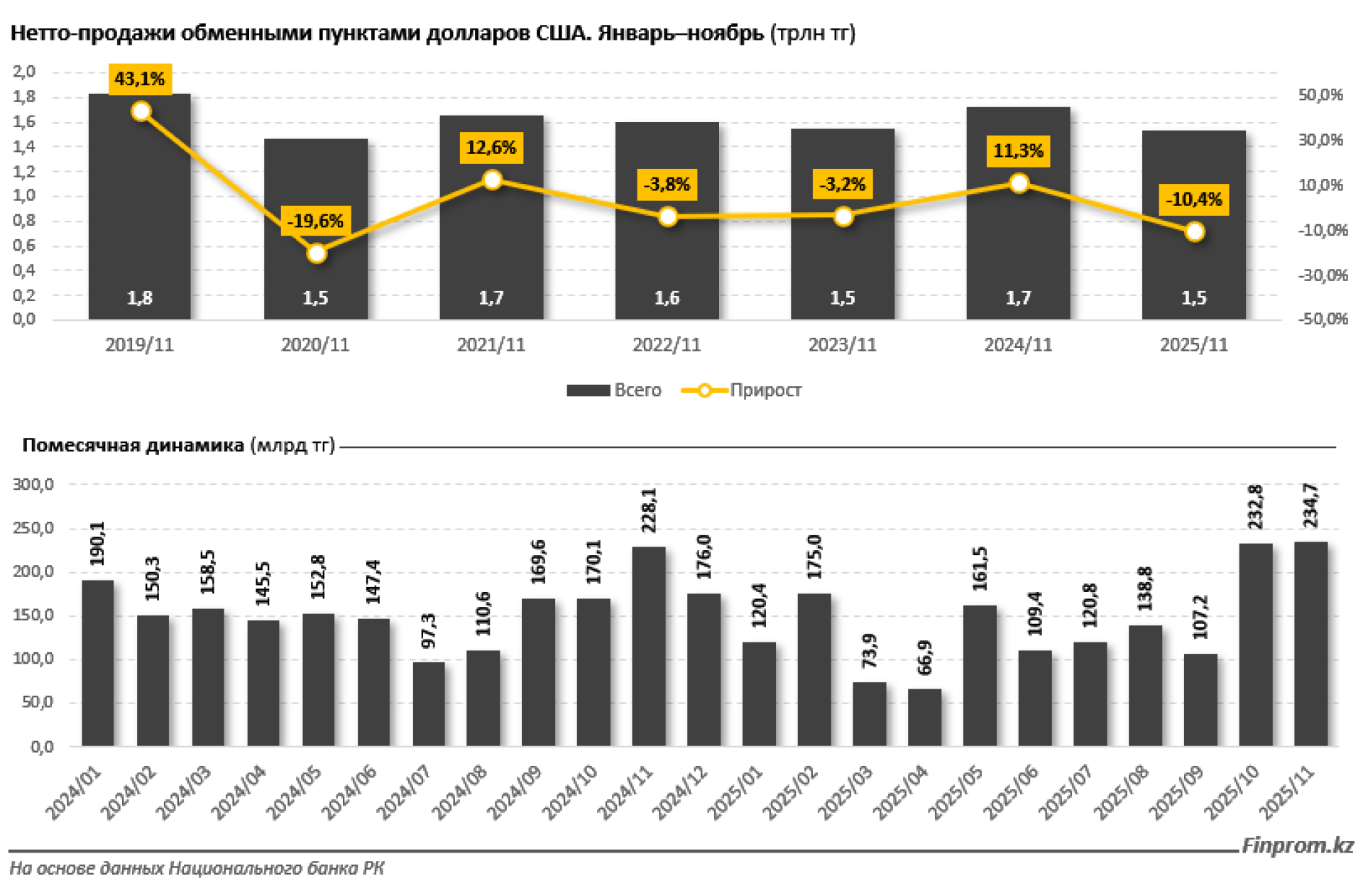 В первые девять месяцев 2025 года ежемесячный объем нетто-продаж долларов варьировался от 66,9 до 175 миллиардов тенге. В октябре объем резко увеличился до 232,8 миллиарда тенге, а в ноябре достиг 234,7 миллиарда тенге, что является максимальным значением с начала года.