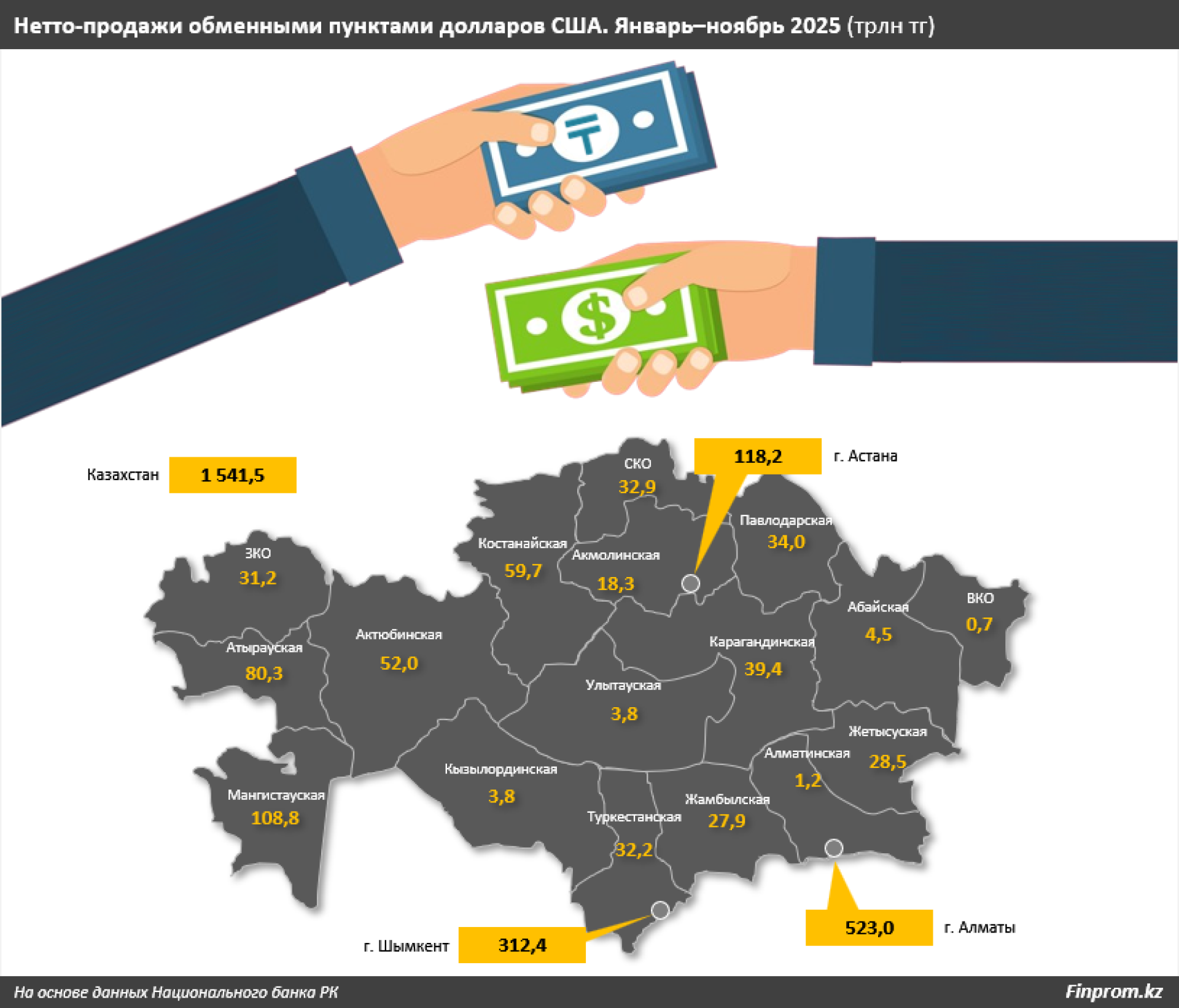 Основные объемы продаж долларов за указанный период пришлись на крупные города. Алматы занял первое место с 523 миллиарда тенге, Шымкент — на втором месте с 312,4 миллиарда, и Астана — на третьем месте с 118,2 миллиарда тенге. В Алматы был зафиксирован рост объемов на 13,4% по сравнению с 2024 годом, в то время как в Шымкенте продажи уменьшились на 30,9%, а в Астане — на 8,2%.