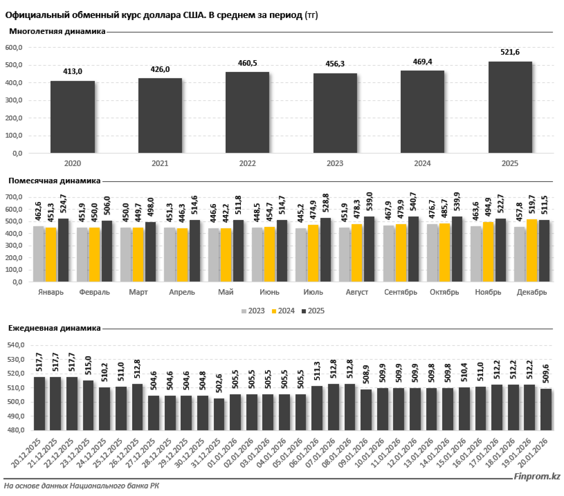 В начале января 2026 года официальный курс демонстрировал умеренную волатильность: с 505,5 тенге в начале месяца он повысился до 509,6 тенге к 20 января, колеблясь в диапазоне 505,5–512,8 тенге.
