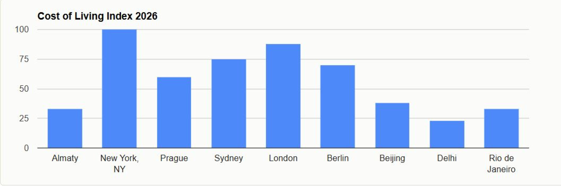 Согласно последнему индексу стоимости жизни, представленному сервисом Numbeo, города мира располагаются по уровню цен и покупательной способности, что позволяет проанализировать экономическую ситуацию в разных регионах.