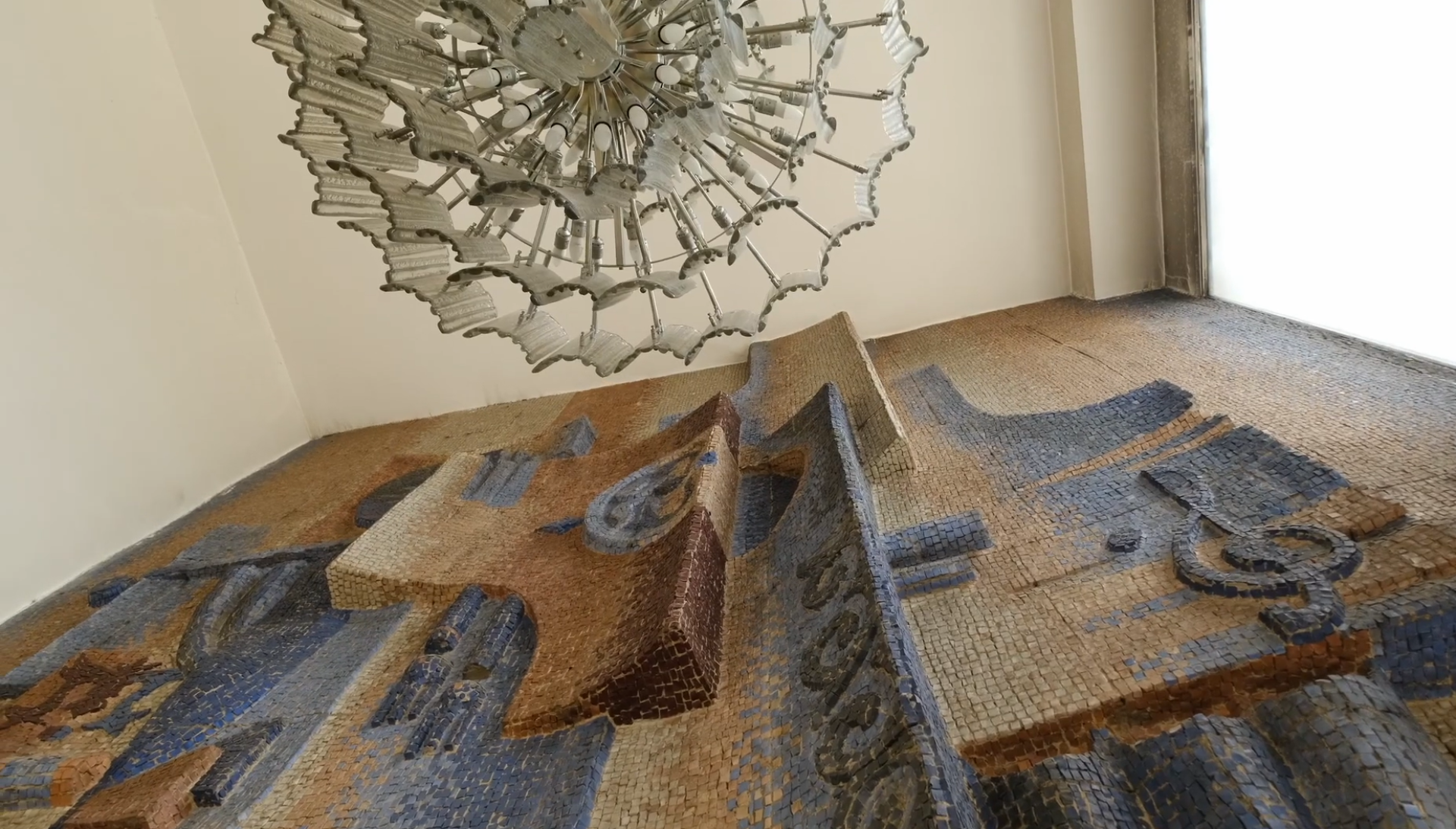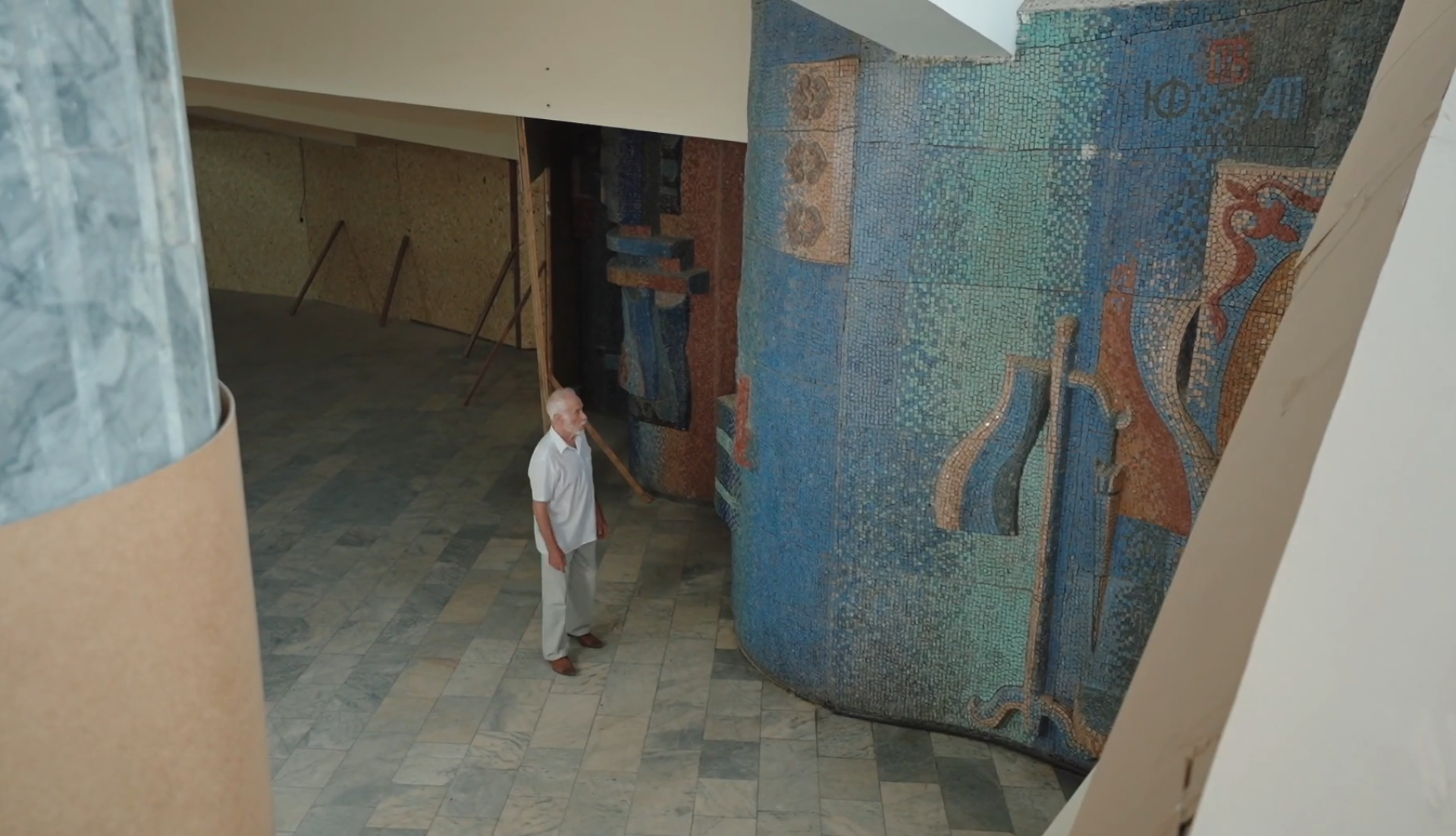 Юрий Функоринео у мозаики в холле театра. Стоп-кадр из видео компании