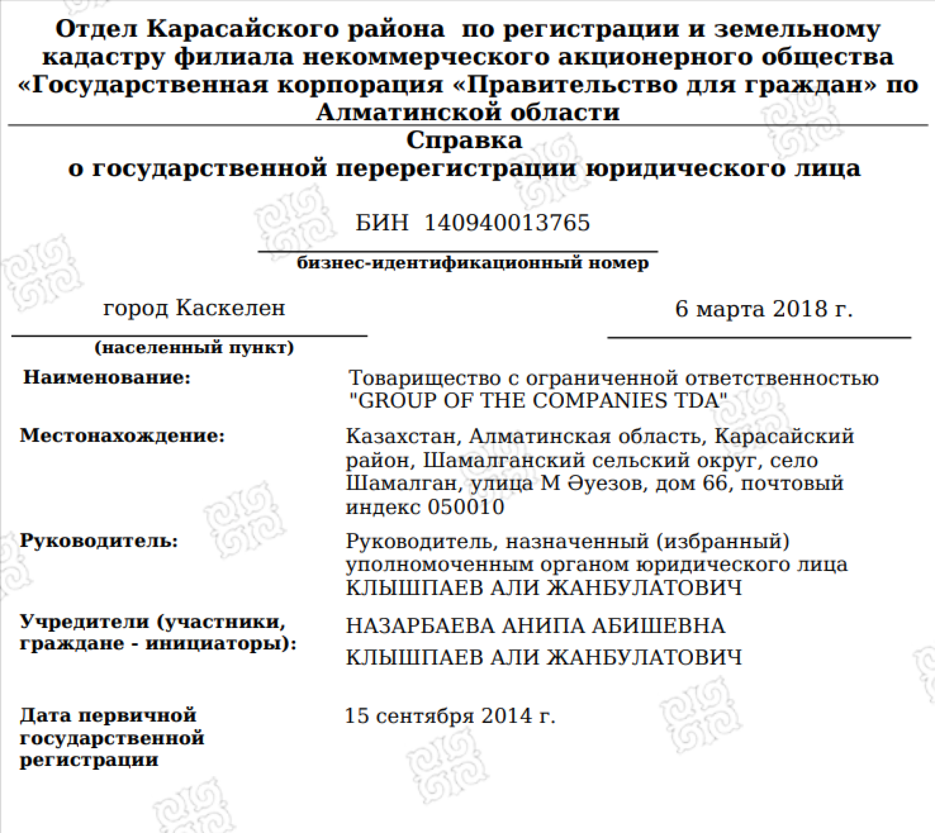 Справка eGov.kzСправка: ТОО Group of the Companies TDA была основана в 2014 году и занимается оптовой торговлей широким ассортиментом товаров без конкретной специализации. Учредители компании – Анипа Назарбаева и Али Клышпаев, который также считается первым руководителем с 2021 года.