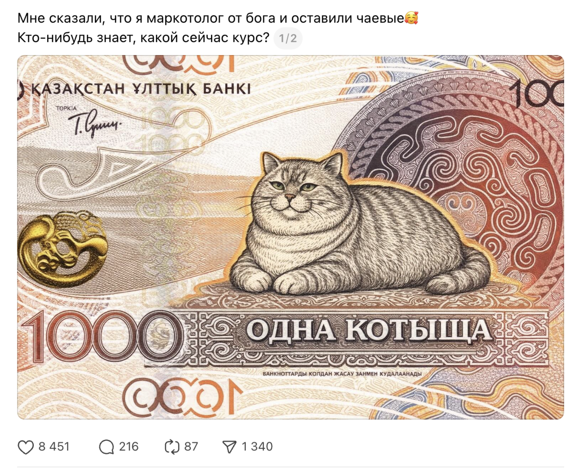 В Казахстане появилась забавная идея о создании новой банкноты номиналом 1000 тенге, на которой изображен милый котик. Этот оригинальный концепт, названный "одна котыща", был предложен одним из граждан и быстро завоевал популярность в интернете, собрав более 100 тысяч просмотров и 8 тысяч лайков.