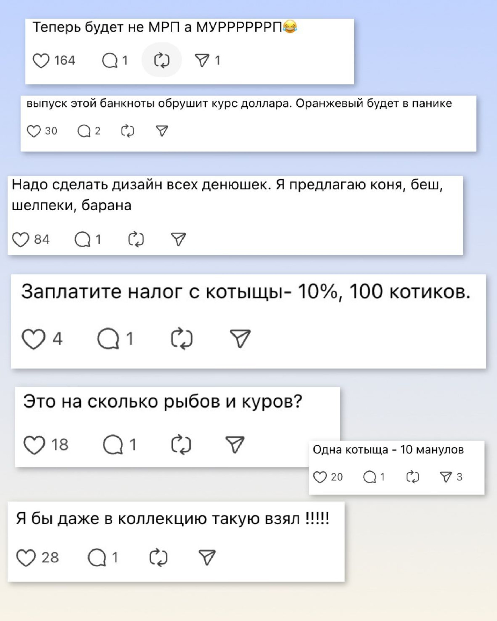 По словам автора идеи, он получил такую "валюту" в качестве чаевых, что и вдохновило его на создание изображения. Пользователи восприняли это с юмором, комментируя, что теперь в Казахстане будет не МРП (минимальный расчетный показатель), а МУРРРРРРП, и шутя о том, как новая валюта повлияет на экономику.