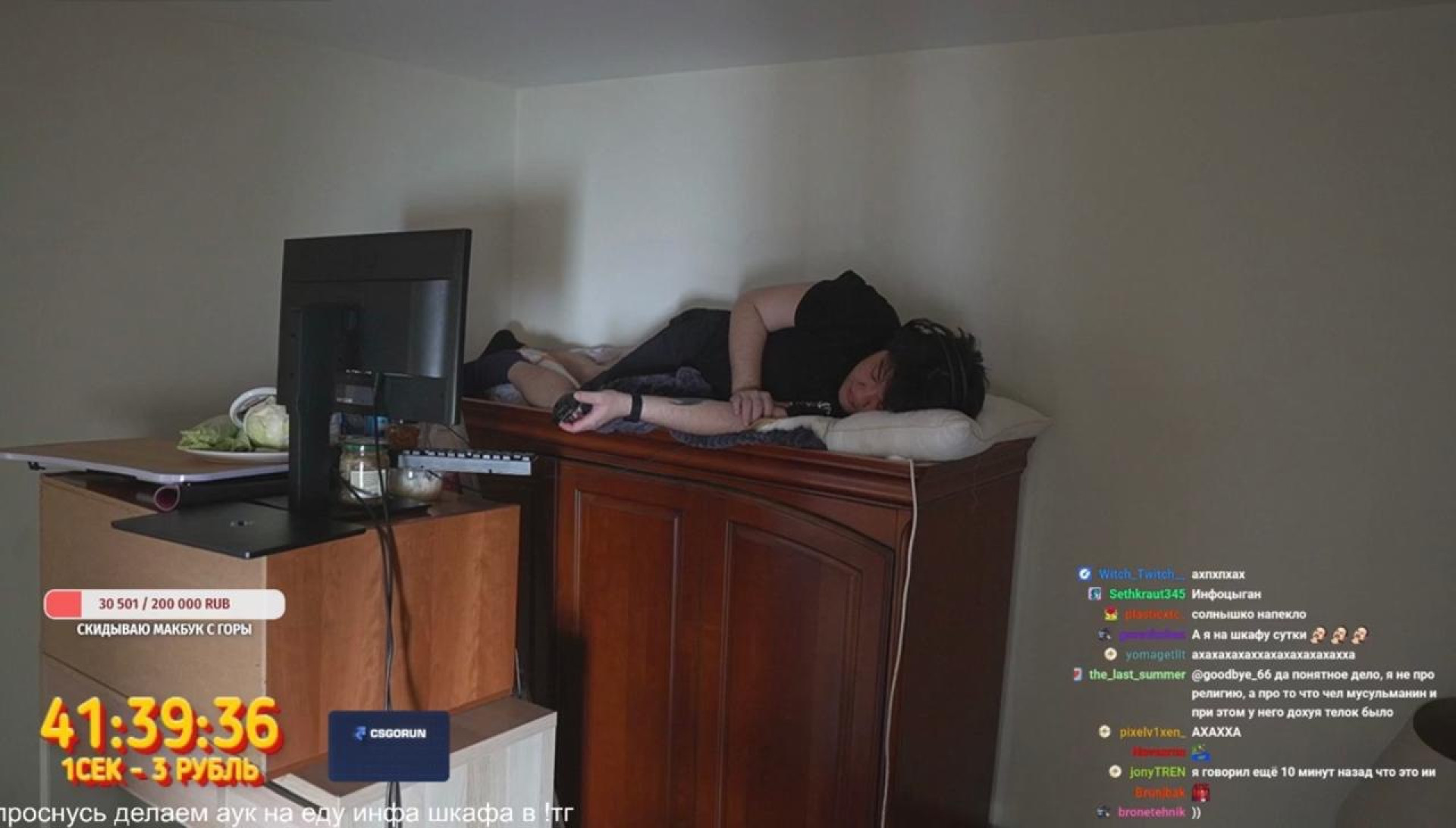 Альмухан продолжает вести трансляцию и даже спит на шкафу, не отключая эфир. Челлендж проходит в режиме нон-стоп, и стример признаётся, что не знает, как всё это завершится.