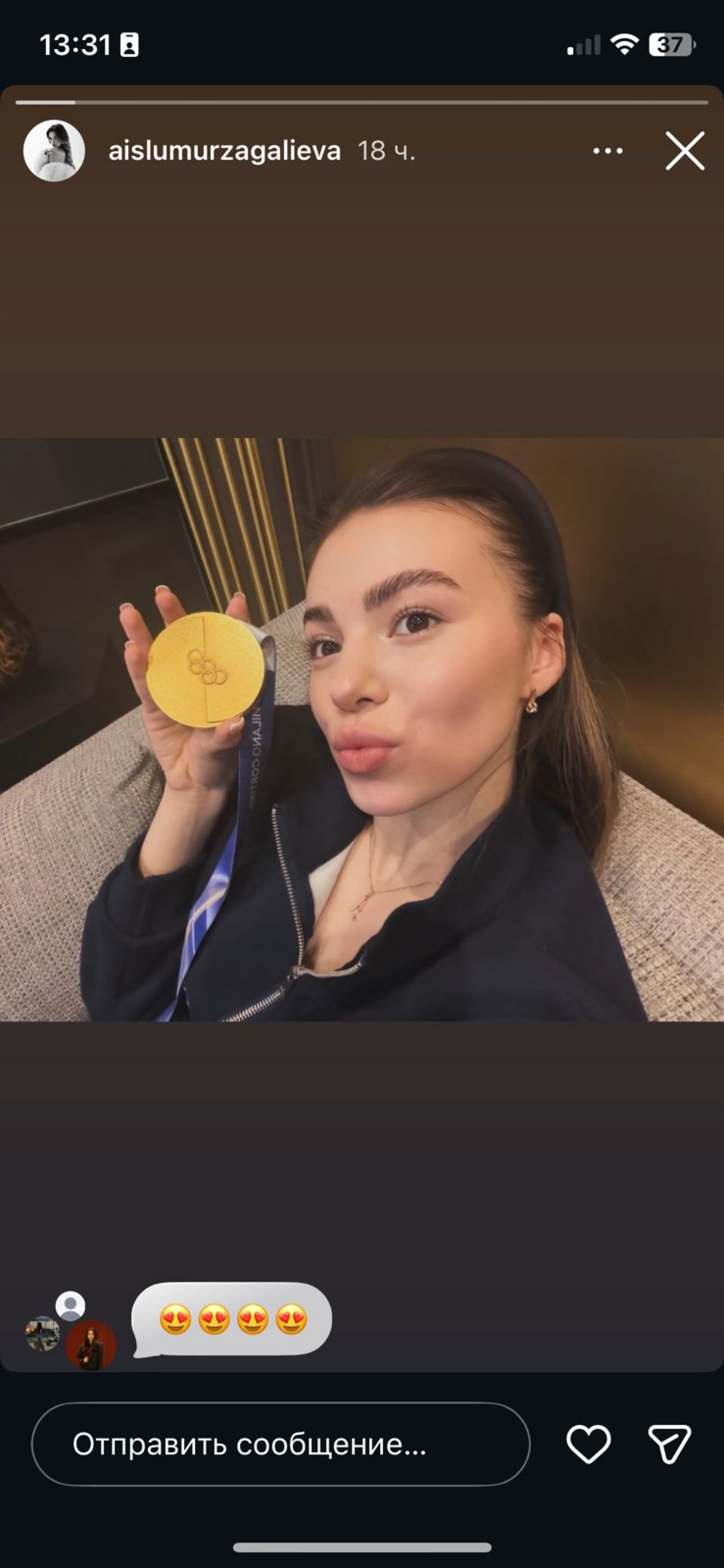 Опубликованное изображение медали может свидетельствовать о близких отношениях между Айслу и Михаилом, ведь не каждому человеку чемпион Олимпиады доверит свою награду.