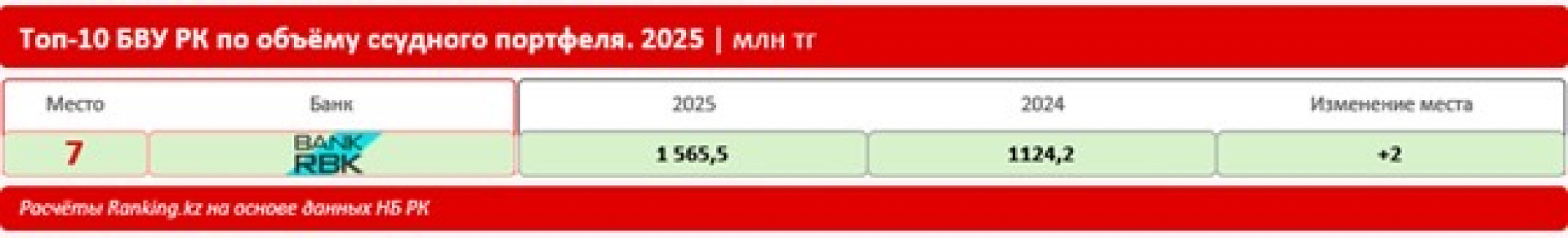 По итогам 2025 года Bank RBK улучшил свои позиции, поднявшись с девятого на седьмое место среди банков Казахстана по объёму ссудного портфеля, согласно данным Национального банка, опубликованным аналитическим порталом Ranking.kz.