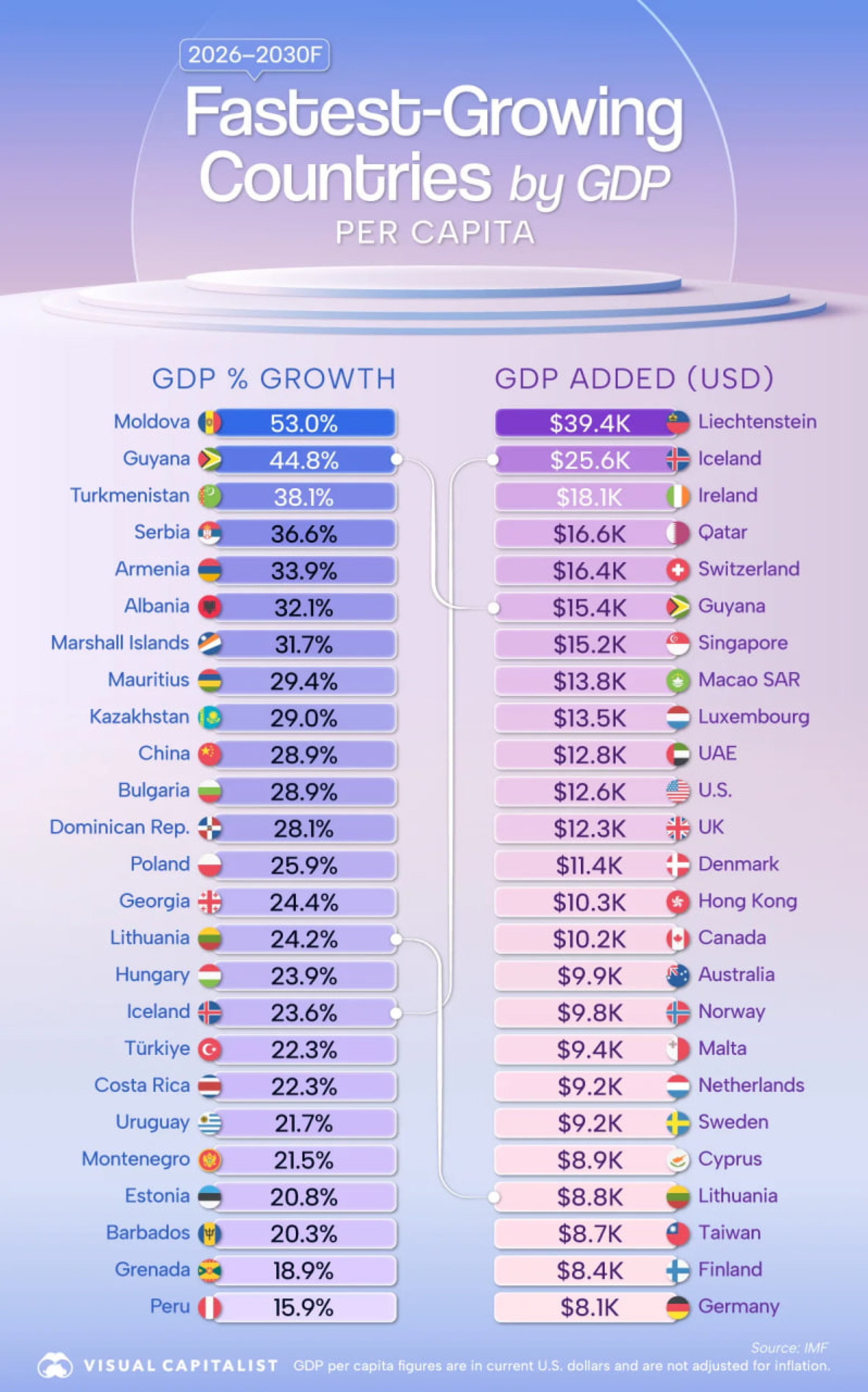 Казахстан занял девятое место в рейтинге развивающихся стран, которые могут продемонстрировать наибольший рост ВВП на душу населения в ближайшие годы. Это исследование было проведено с использованием данных Международного валютного фонда и представлено порталом Visual Capitalist.