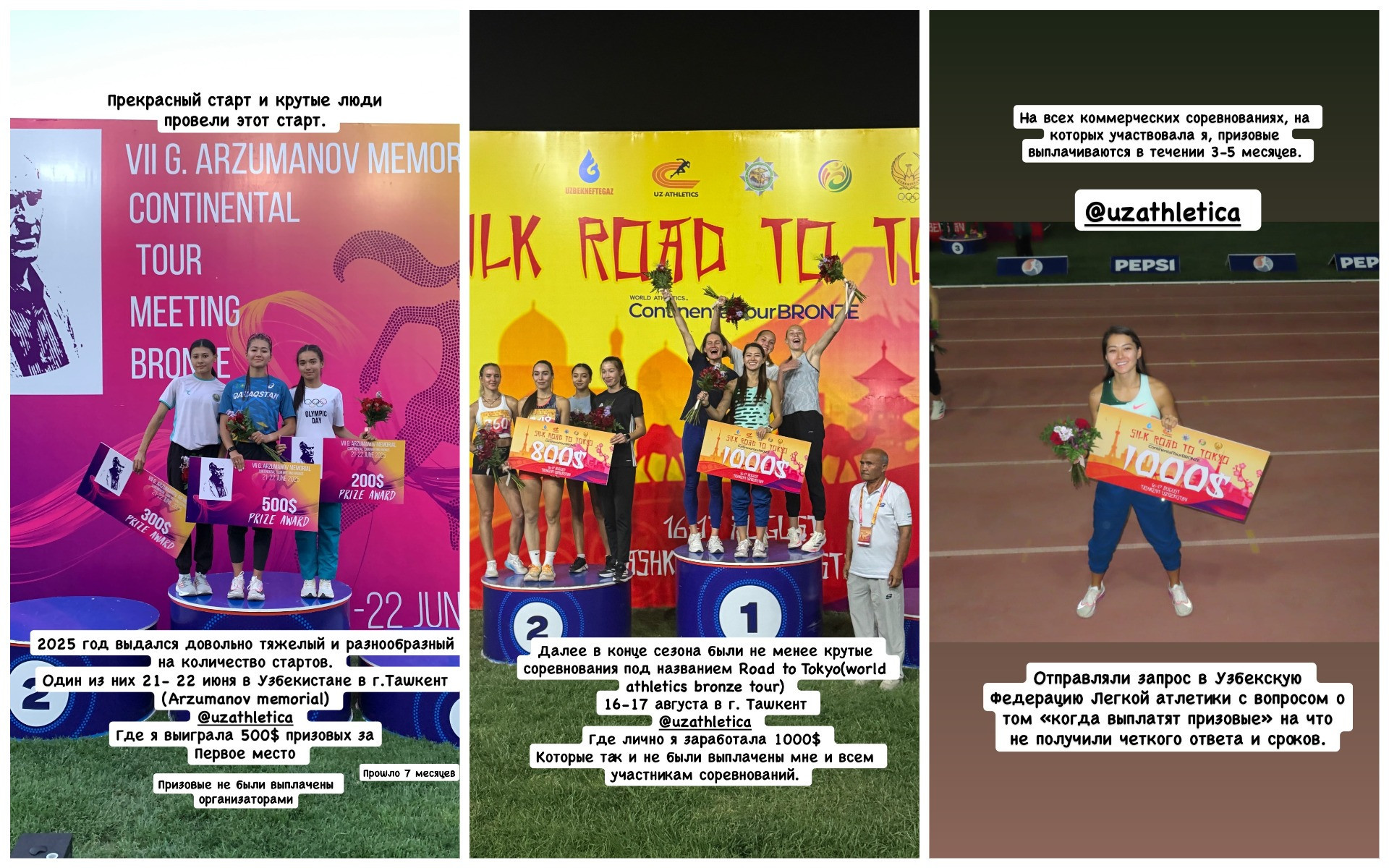 Четырёхкратная чемпионка Азии в беге на 400 метров из Казахстана, Аделина Земс, столкнулась с проблемой невыплаты призовых от Узбекистанской федерации легкой атлетики. Ситуация продолжается уже около года.